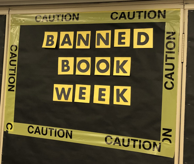 “People are enjoying the display. It is interesting to read the quote and then try to figure out what book is behind the cover. Hopefully, once you read the quote, you will want to pick up the book and see which one it is,” said Ms. Lucas. “We have also been posting information about Banned Books Week on our Facebook page for those that can’t get into the library.”