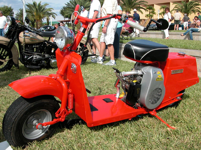 I immediately started to think back to a late October day when a couple of friends and I were able to get one for $15. It was at a junk yard in Brooklyn and the year was 1959. It did not come with the registration. That was $15 more, which we were supposed to pay a week later. So we pushed the scooter through the streets to my friend Joe’s garage behind his house. His father had recently died and no one in his family ever went into the garage. Safe place to hide the scooter. And also a good place to get it cleaned up and running. And this scooter was red.