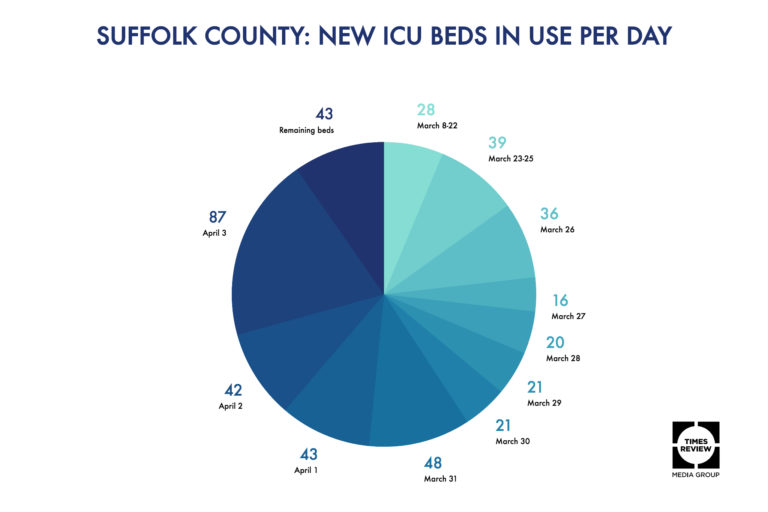 The number of COVID-19 patients being treated in intensive care units at Suffolk County hospitals has more than tripled in the last week, leaving just 43 ICU beds currently available, according to the latest numbers provided Friday by Suffolk County Executive Steve Bellone.