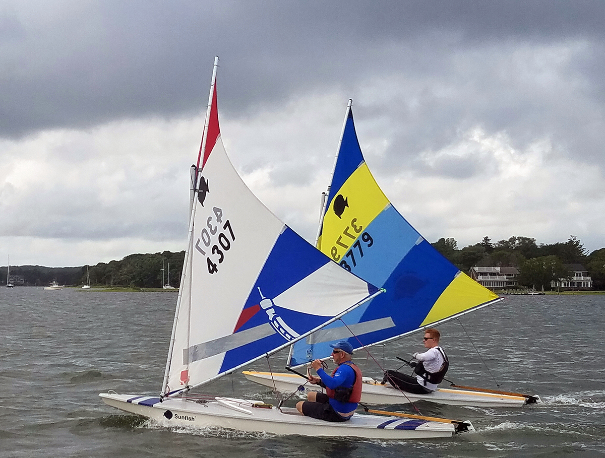 We are a very congenial club, open to all, with no dues, no fees and no clubhouse. The sailing is great, the camaraderie is superb, and we just have tremendous fun. Normally, all sailors, novice to expert, are welcome, but, due to COVID-19, for the time being the club is only allowing experienced Sunfishers who are physically capable of righting their own boats, so as to avoid unnecessary contact with the chase boat crew.
