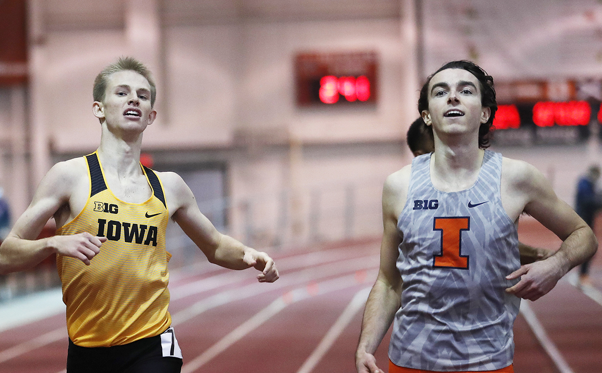 Nine athletes from Iowa, Nebraska, Illinois and Minnesota answered the starter’s gun in the 800-meter run (5 yards less than half a mile). Running on the Corn Husker state-of-the-art Bob Devaney Sport Center’s 200-meter banked oval track, fellow Hawkeye, Alex Still, opened a commanding lead through 400 meters.