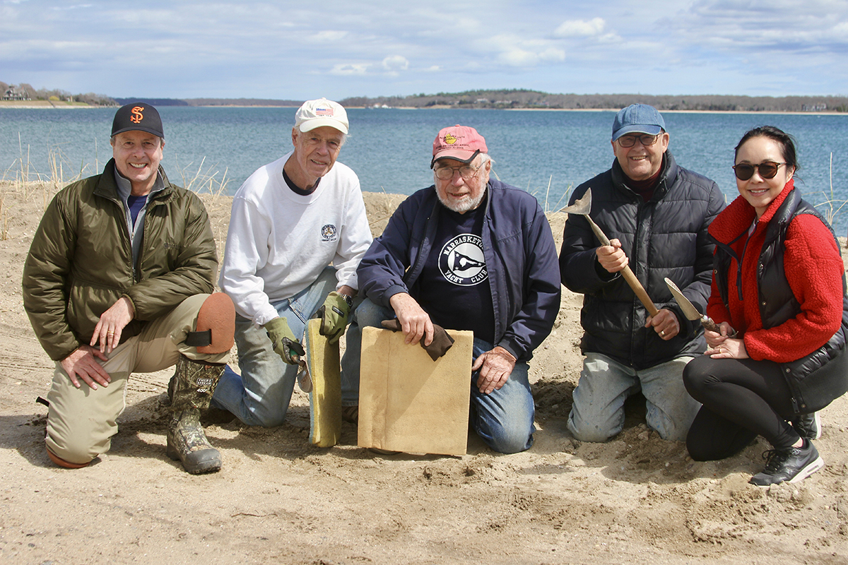 Members of the Silver Beach Association volunteered on April 17 to plant 760 beach grass seedlings at Shell Beach on the town property, which was repaired by the Highway Department.