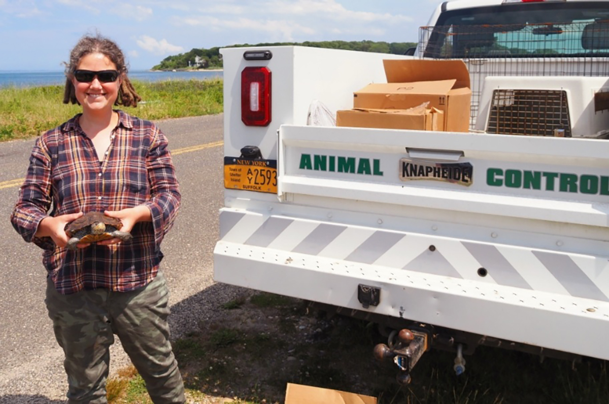 Animal Control Officer Jenny Zahler (above), with help from Trish Anzalone, released a diamondback terrapin named Hopscotch on the Ram Island Causeway on Monday.