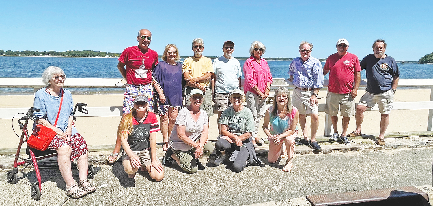 Some of the many Islanders who were taught to swim by Jack Wroble gathered on Sunday, July 10 at a plaque in his honor at Crescent Beach to honor his memory on his birthday. Back row from left, Greg Senken, Patricia (Senken) Hitscherich, Andrew Reeve, Hoot Sherman, Marylou Putignano, Chris Carey, Rich Bond, Art Barnett. Front row from left, Karen Wroble (Jack’s daughter), Nell Lowell (his granddaughter, the current swim instructor), Sue Hawthorne, Kathie “Hulse” Kokis, Sherri Cavasini. (Credit: Hayley Lowell)