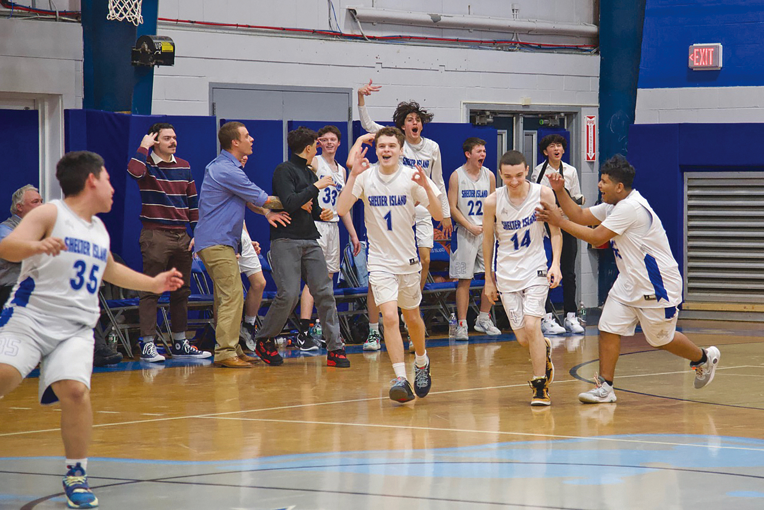 Charlie Murray, number 14 above, who has not played much this season, met the moment by hitting a big 3-point shot in the 4th quarter of the varsity boys basketball team’s game on Feb. 7.